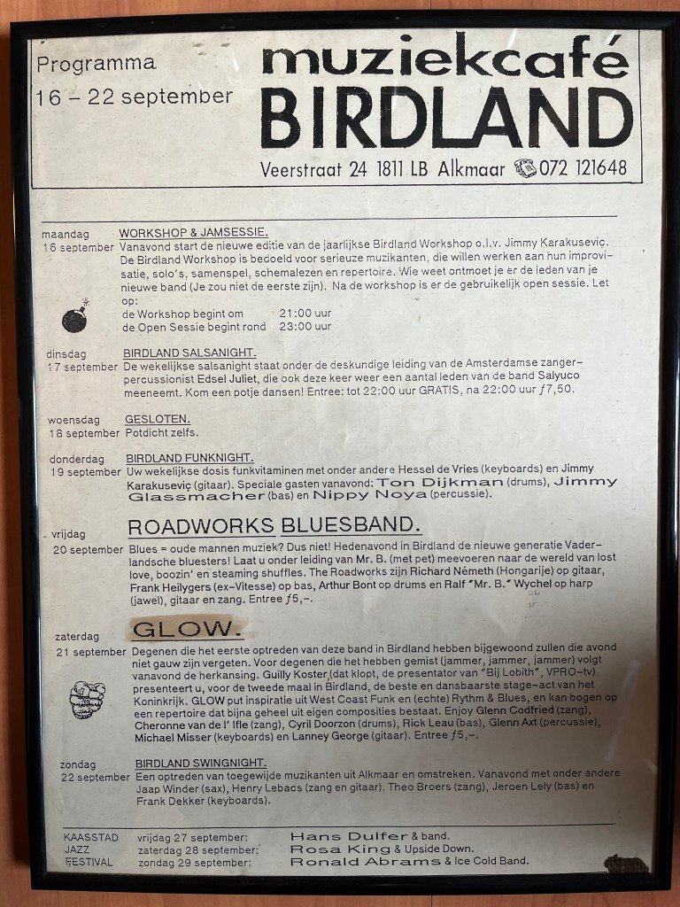 In 1991 liepen wij Guilly Koster tegen het lijf. Toen bekend als presentator bij de VPRO en runde toentertijd Sahara management. Via hem kregen we ons allereerste optredens. De term “go big or go home” kwam dan ook van hem. Dat was een kreet om ons te empoweren zeg maar. In die jaren had je muziekcafé Birdland en daar zouden we ons debuut maken. Daar kwamen de “grote” muzikanten graag spelen…van Jan Akkerman tot Hans Dulfer enz. En wij als beginnend bandje helemaal natuurlijk. Het vervoer van onze weinige apparatuur daar naar toe was hilarisch. Guilly haalde het op met een 12 meter lange vrachtwagen. Hij aan het stuur met twee bandleden naast hem (waaronder ik). En dan nog een auto er achter aan. Alkmaar here we come! Aangekomen…de vrachtwagen paste niet in het nauwe straatje…tillen dan maar, no problem! Nu moet je weten dat de baas van Birdland Jimmy Karakusavich ook nog eens een goeie gitarist was (R.I.P.). Die man had goeie oren en hij liet niet zomaar bandjes in zijn café optreden dus was het voor ons heel erg spannend allemaal. De avond verliep goed en het publiek was tevreden en de baas gelukkig ook. Pffff….dat was letterlijk en figuurlijk zweten. We genoten met volle teugen van de avond en het resulteerde in een nieuwe uitnodiging voor over 6 maanden ( zie foto hieronder).
