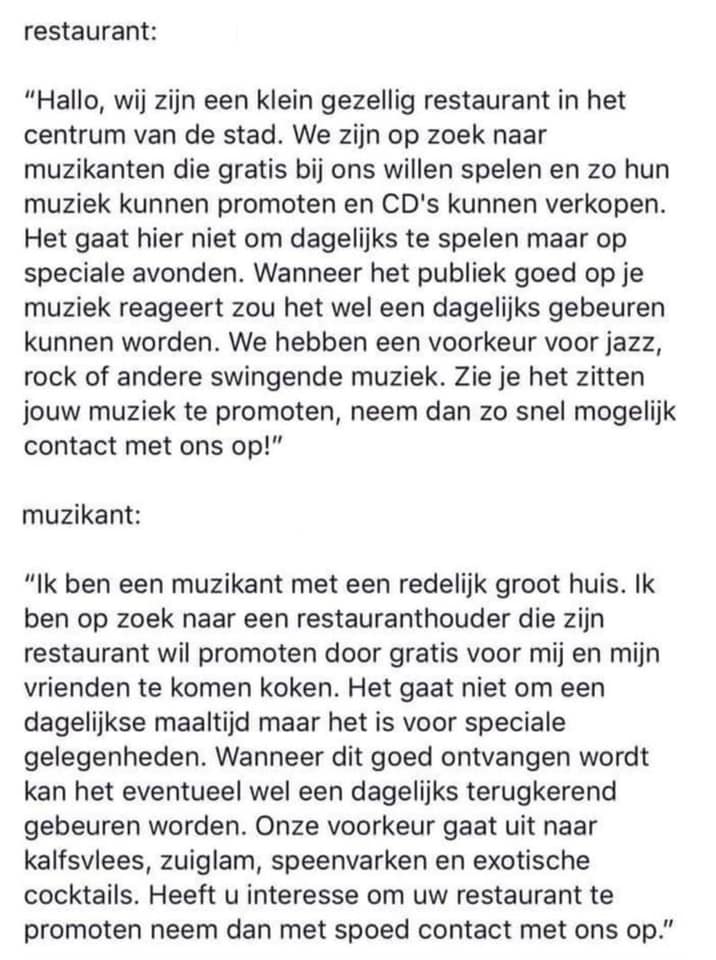 Mensen willen een live band voor hun feest maar willen er niet of nauwelijks voor betalen en dan ook nog die denigrerende houding naar de muzikanten toe, het is ongelofelijk gewoon! Van de frituur en drankjes in de schuur of bierhok tot en met de verzoeknummers die je per feest nog eens apart moet instuderen. Hoe grappig dit ook is geschreven, dit komt zeer regelmatig voor weet ik uit eigen ervaring.