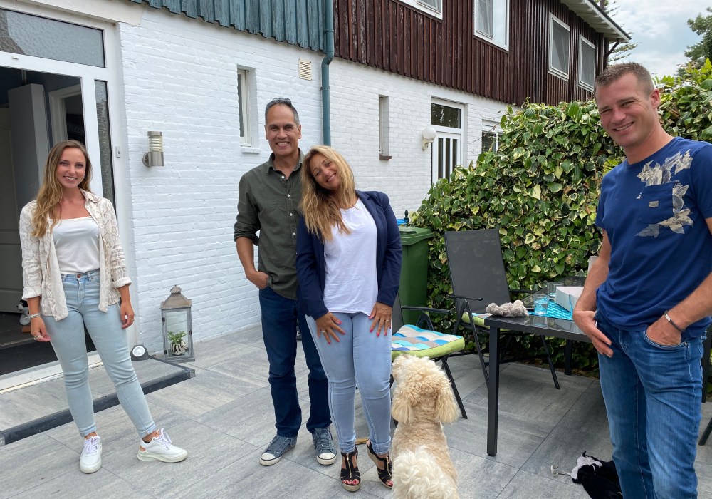 Anderhalve week voordat ze daadwerkelijk begonnen met de werkzaamheden kwamen ze eerst de introductie filmpjes met ons opnemen. Dat was op een mooie zonnige maandagochtend. Op maandagochtend 9 uur stonden ze voor onze deur, we hebben even zitten kletsen met elkaar onder het genot van een kop koffie terwijl de cameraman zijn spullen begon uit te pakken om alles klaar te zetten voor de “voor en na” beelden van de tuin en de huiskamer. Daarna waren wij aan de beurt voor het interview. Nu heb ik totaal geen ervaring met het praten voor een camera en ik heb ook geen flauw idee hoe ik het er vanaf heb gebracht. Je moet constant alert zijn en in de gaten houden dat je niet recht in de camera kijkt terwijl je ook probeert om jezelf te blijven. Ik vond het lastig in ieder geval. We hebben dus de maandagochtend introductie opnames gehad en dan zouden ze op de woensdag in de week daarop gaan beginnen met de werkzaamheden. Alle ramen aan de achterkant van het huis worden dan zowel beneden als boven afgeplakt zodat we niet kunnen zien wat zij allemaal aan het doen waren in de tuin want het moet natuurlijk een verrassing blijven. Omdat we niet gestoord wilden worden tijdens onze kantoorwerkzaamheden en om al die extra prikkels te vermijden hadden we besloten om een paar dagen, voor de oplevering, in een hotel in de buurt te verblijven. Zij konden daardoor ook eerder aan onze huiskamer beginnen wat hun natuurlijk ook beter uit kwam.
