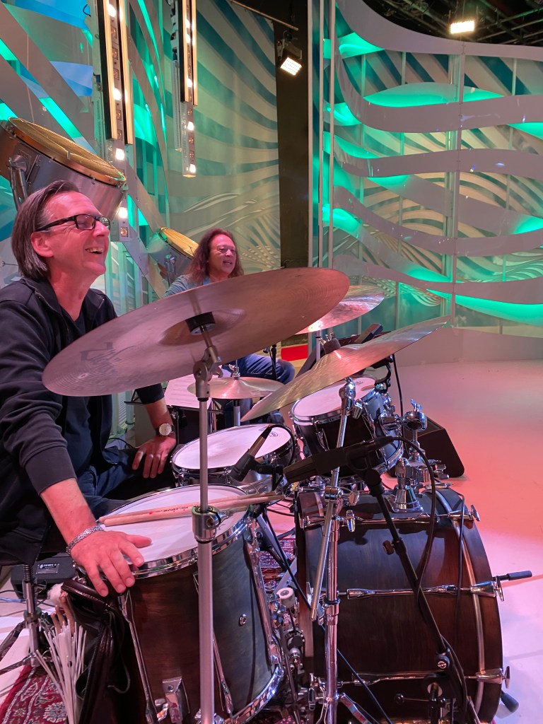 Om 12.45u reden wij met z’n allen richting Hilversum om eerst bij een Italiaans tentje te lunchen en even te relaxen voordat we richting de studio gingen wat zich 1,5 km verderop bevindt. Vanuit hier reden we achter elkaar aan richting de TV studio’s van MAX. Daar aangekomen meteen de spullen uitladen en bij binnenkomst op de studiovloer zag ik zoveel personeel lopen die als een geoliede machine samen aan het werk waren. Aangezien wij allemaal ervaren muzikanten zijn, waarvan er twee van ons als eerder bij MAX hebben gespeeld, stonden we binnen no time speelklaar. Het is zo mooi om te zien dat ondanks men onder tijdsdruk staat, toch aardig en vriendelijk blijft waardoor de totale sfeer in de studio heel relaxed is en blijft. Geen stress, chaos of hectiek. Alles moest wel vlug staan natuurlijk. Nou, ik heb dat wel anders meegemaakt met veel minder grote events. Doordat alles zo soepel en stressloos verliep konden we met z’n allen genieten van alles wat op deze dag stond te gebeuren.
